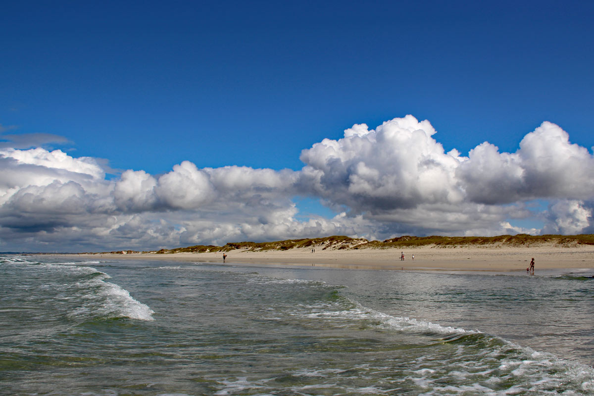 Der riesige Strand bietet genug Platz, selbst an warmen Tagen und Wochenenden und du kannst endlos lange spazieren gehen und dir den Wind um die Nase wehen lassen. Du solltest dir aber auf alle Fälle einen Sonnenschirm mitbringen, denn Schatten suchst du hier vergebens. Der Strand eignet sich auch für kleine Kinder, da die zurückweichende Flut immer wieder kleinere Priele hinterlässt, in denen selbst die Kleinsten wunderbar und sicher planschen können. Den Strand erreichst du von mehreren Zugängen über die Düne, du musst allerdings immer etwa 300 Meter laufen. Parkplätze sind in ausreichender Zahl an allen Zugängen vorhanden. Windschutz kannst du an den verschiedenen Strandpavillions kostepflichtig ausleihen.