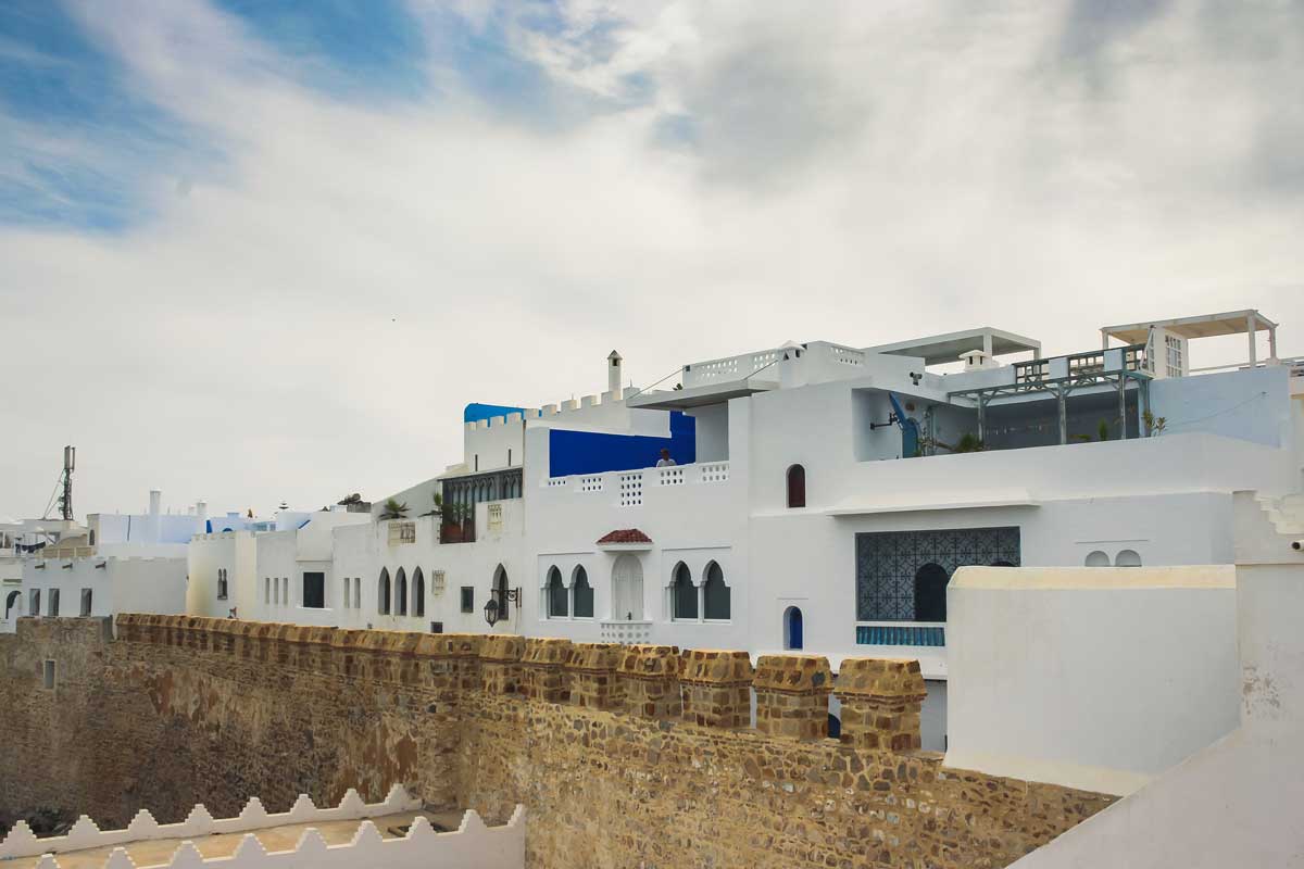 Lass deinen Spaziergang durch die Medina am Meer enden. Unterhalb der befestigten Stadtmauer klatschen die Wellen an die Steine. Am Aussichtspunkt Caraquia findest du den besten Blick auf die Medina, die Stadtmauer und das Meer. Besonders im Abendlicht der untergehenden Sonne ergibt das ein stimmungsvolles Bild. Das Weiss der Fassaden, die goldgelben Steine der Wallmauer und das türkisblau des Meers bilden einen wunderbaren Farbdreiklang. Vielleicht ruft dazu noch der Muezzin von der nahegelegenen Moschee. Dann erlebst du das perfekte Marokko- Feeling.