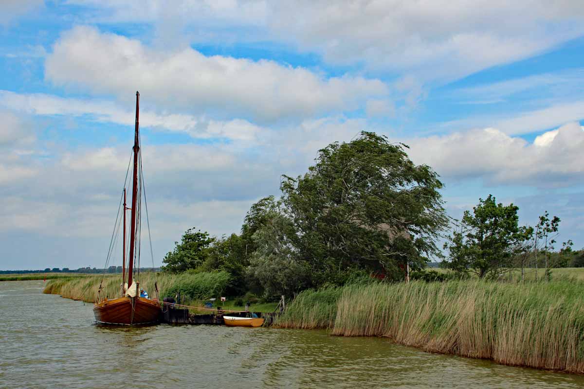 Wenn du magst unternimmst du hier eine Zeesbootsfahrt entlang der grünen Ufer des Boddens. Es gibt zahlreiche Angebot für Touren auf den alten Fischerbooten. Oder du wanderst ein bisschen entlang des Ufers über unbefestigte Wege nach Barnstorf, ein kleines Weiler am Bodden mit zahlreichen alten Reetdach-Höfen, die heute zu Ferienhäusern umgebaut wurden. Dort findest du die Kunstscheune, eine alte Hofscheune die heute den örtlichen Künstlern als Ausstellungsort dient.