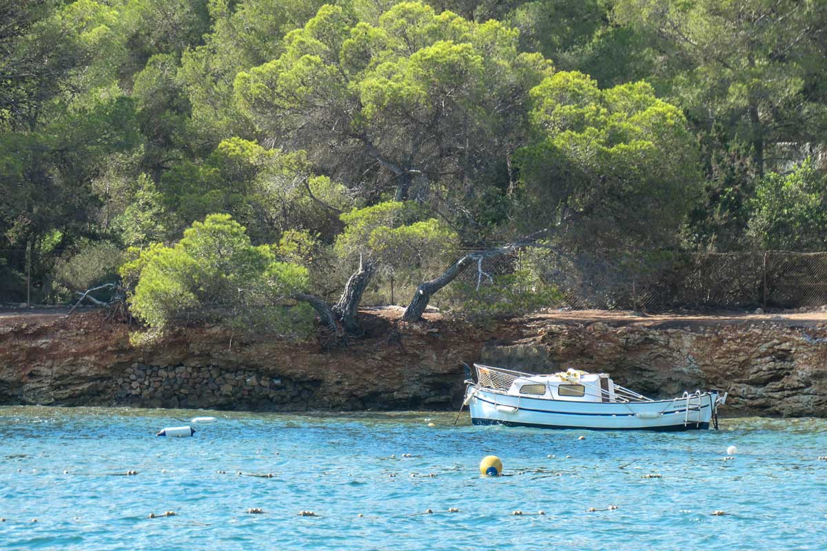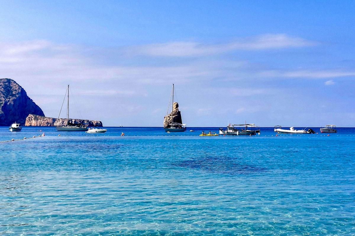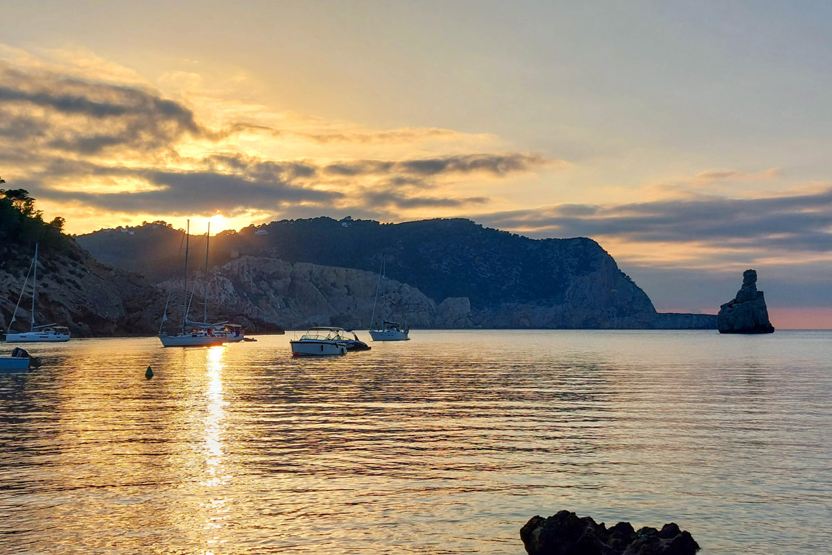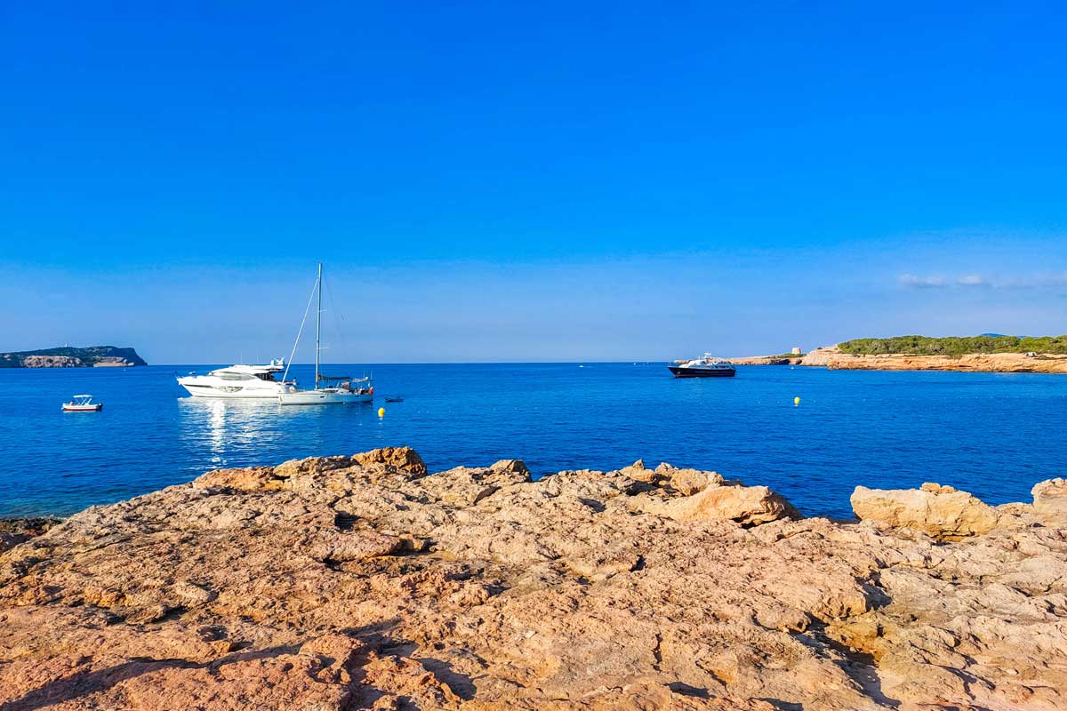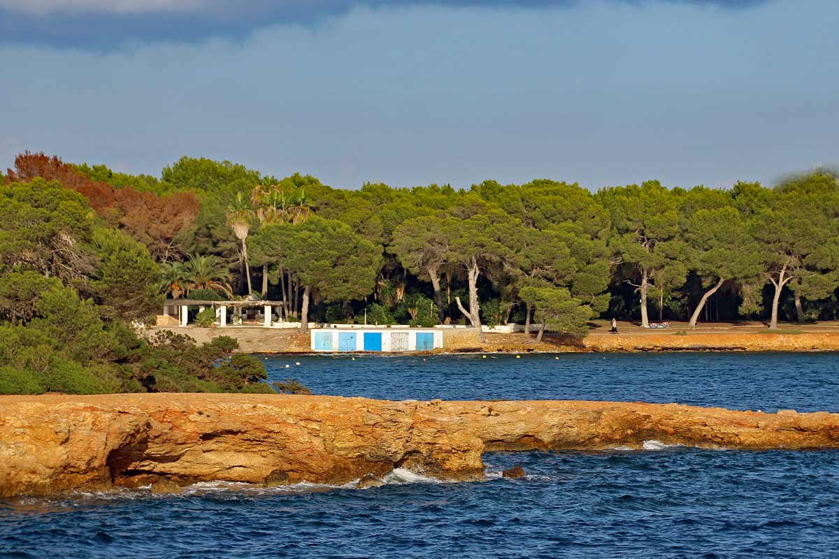 Dieser imposante Felsen ist ein beliebter Ankerplatz für die Yachten, die von San Antoni oder Santa Eularia hier hin fahren, aber auch ein guter Platz zum schnorcheln. Das Wasser ist hier so klar, daß du selbst ohne Taucherbrille viele Fische sichten kannst. Eingerahmt wird der Strand auf beiden Seiten von einigen Varaderos (Fischerboothütten) und ein paar kleinen Restaurants.