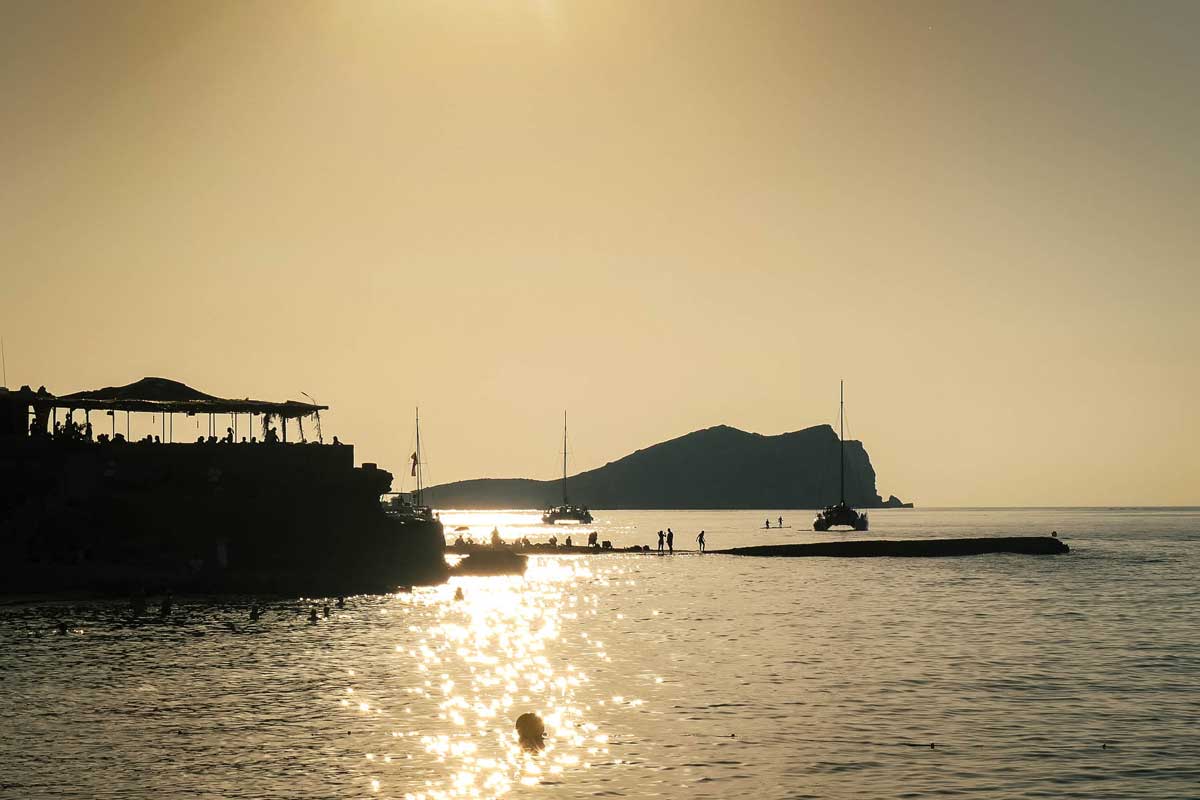 Zuletzt nehme ich dich mit zur Cala Comte. Ich persönlich finde sie zum schwimmen nicht so schön, aber es ist eine der Stellen an der Westküste, wo du den besten Sonnenuntergang sehen kannst. Auf den flachen Felsplatteaus haben sich mehrere hippe Beachbars und Restaurants angesiedelt und bieten bei Tapas und Sangria den besten Blick auf die untergehende Sonne. Im Sunset Ashram- einem angesagten Club- treten in der Saison wechselnde Djs auf.