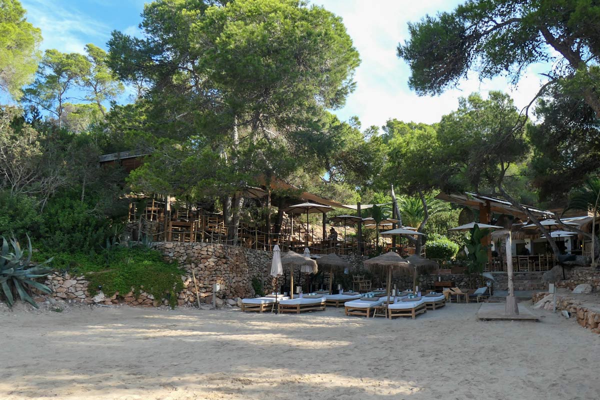Die Bucht wird fast vollständig von einem sehr schönen Chiringuito mit Beachclub ausgefüllt. Neben Speisen, Getränken , Liegen und Sonnenschirmen findest du hier auch typisch Kleidung im "Ibiza Boho Style". Das ganze hat allerdings seinen Preis. Vor dem Beachclub gibt es wenig Platz, wo du dein Handtuch frei auslegen kannst.