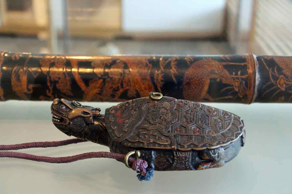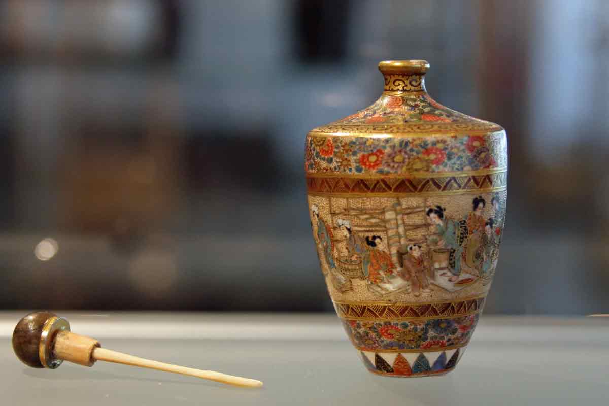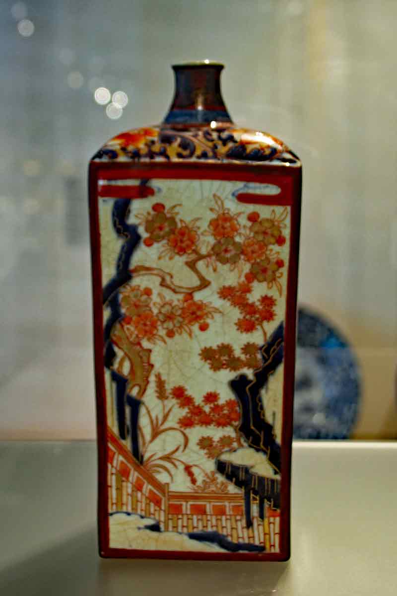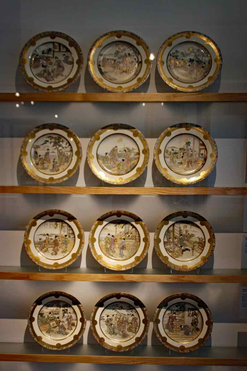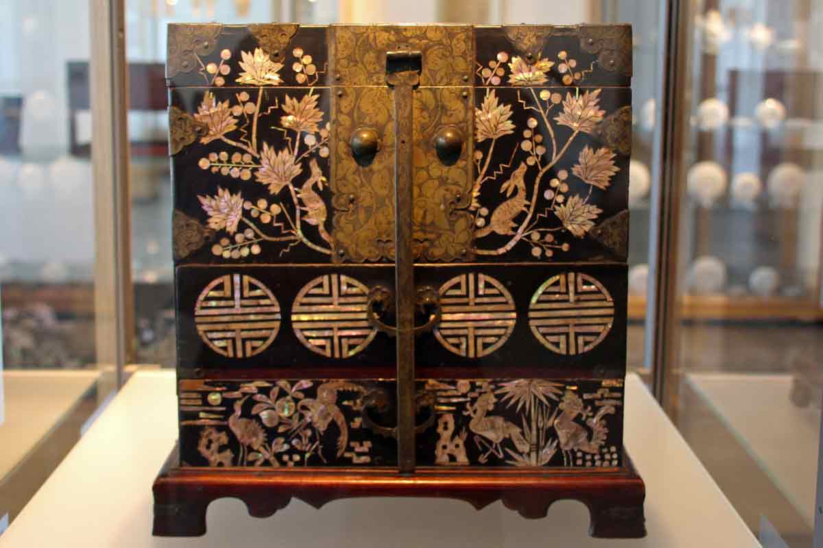 Die japanische Abteilung ist nur sehr klein und zeigt zierliche Porzellanfiguren, hüsche Perlmuttdosen mit Intarsien und typische Tuschezeichnungen. Eindrucksvoll ist eine große Tuschezeichnung des Kölner Doms im japanischen Stil des Kaligraphen Uchiyama Ukai .