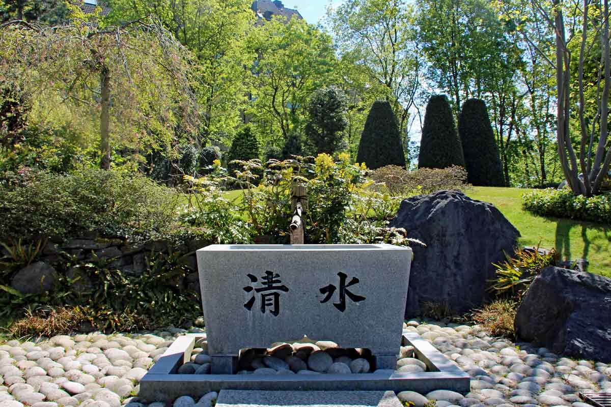 Besonders sehenswert ist die gesamte Gartenanlage mit allen Elementen, die einen japanischen Garten auszeichnen. So findest du eine Brücke, eine Pagode, diverse Steinlaternen, einen Brunnen, das Holzeingangstor und verschiedene Wasserläufe, sowie eine Vielzahl der traditionellen Gehölze. Zu jeder Jahreszeit bietet der Garten einen sehr gepflegten und harmonischen Gesamteindruck und zeigt sich im jahreszeitlich perfekt inszenierten Gewand.