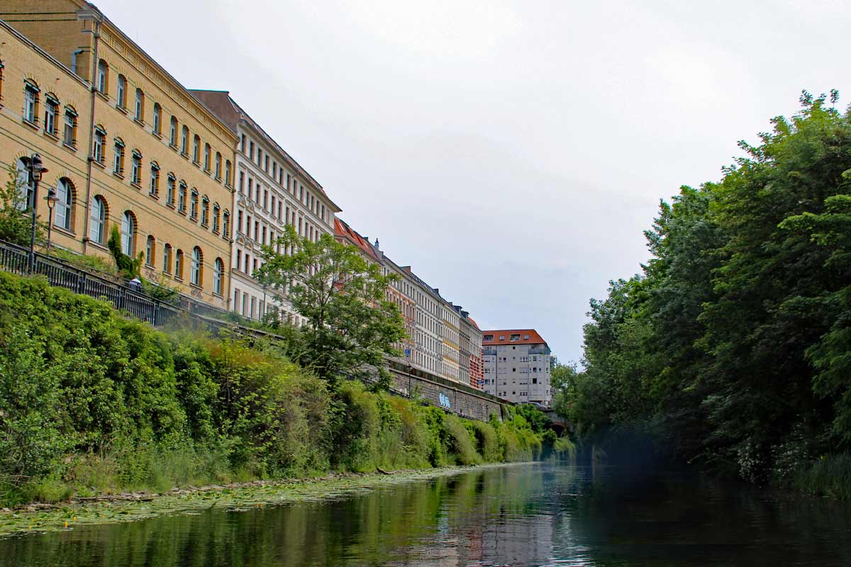 Weiter geht es entlang dem Gelände der alten Buntgarnwerke, einer ehemaligen Garnfabrik aus dem späten 19. Jahrhundert. Hierbei handelt es sich um eines der größten Industriedenkmäler Deutschlands, das heute in teuerste Loft-Wohnungen umgewandelt wurden. Die ganze Fahrt durch stille Flusslandschaften mit altem Baumbestand lässt dich schnell vergessen, daß du mitten in der Stadt bist. Du gewinnst einen ganz neuen und grünen Blick auf Leipzig.