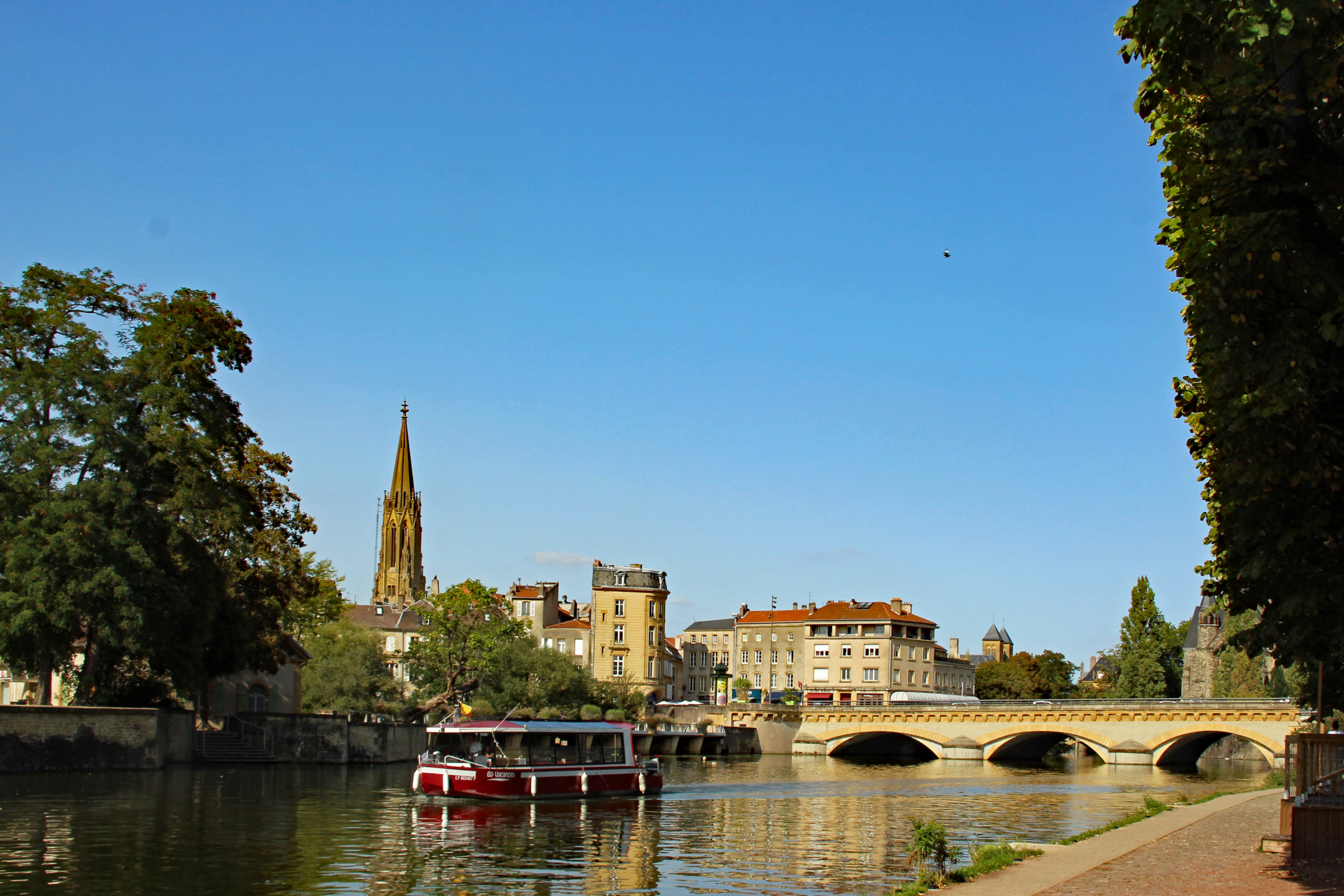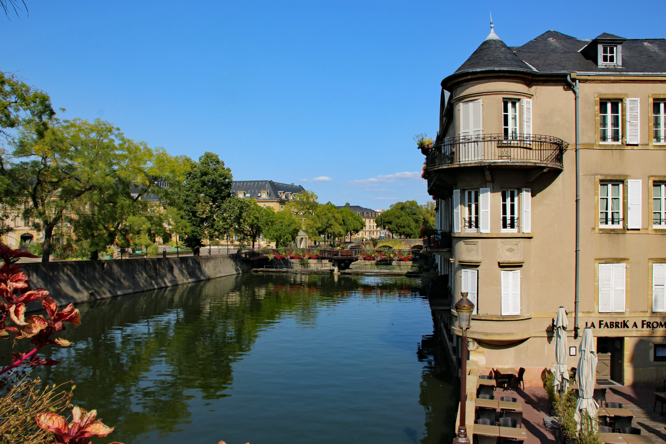 Wenn du am Marché couvert den Hang weiter hinunter läufst, führen dich mehrere verwinkelte Gassen mit unzähligen Restaurants, Bars und Cafés an die Ufer der Seille. Zahlreiche Brücken überspannen den Flussarm hier und ein Spazierweg auf Wasserhöhe gewährt dir schöne Ausblicke auf beide Seiten der Stadt. Du kannst dem Weg folgen und gelangst nach kurzer Zeit an den kleinen Freizeithafen. Hier werden Tretboote und Kanus verliehen, mit denen du selber vom Wasser aus die Stadt erkunden kannst. Oder du gehst mit der Solaris auf Tour, die dich ein Mal rund um die Stadt über Seille und Mosel schippert. Für diese Tour musst du dich vorher telefonisch anmelden. Alle Infos findest du auf der Homepage. Ich war dafür bedauerlicherweise zu spät.