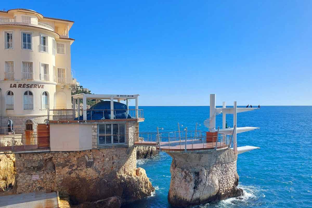 Wenn du am östlichen Ende des Hafens die Treppen hoch gehst und dann dem Quai de Commerce folgst, gelangst du nach etwa 10 Minuten zu Fuss zum Top-Spot Le Plogeoire, einem Sommerrestaurant mit instagramablen Sprungturm. Vom kleinen Strand am Fuss des Leuchtturms davor hast du einen guten Blick. Und wenn du dann noch weiter gehst, kommst du auf den Sentier Littoral der dich nach Villefranche sur Mer bringt. An lauen Frühlingstagen eine wunderschöne Wanderung am Meer entlang.