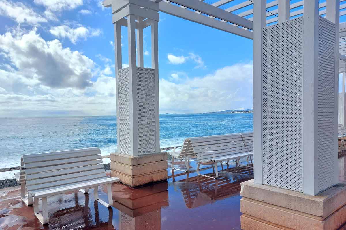 Wenn du die Promenade wirklich erleben willst, musst du mehrmals am Tag hierher kommen, denn sie wechselt ihr Gesicht mit dem Sonnenlicht. Am frühen Morgen ist es noch recht ruhig, wenig Menschen sind unterwegs, du hast die blauen Stühle für dich alleine, das Meer leckt sanft und leise ans Ufer.
