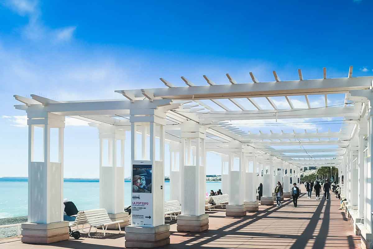 Wahrzeichen an der Promenade sind - neben dem weltberühmten Hotel Negresco- die azurblauen Stühle, die ordentlich aufgereiht zum Verweilen mit Blick auf das offene Meer einladen. Neu dazu gekommen sind vor einigen Jahren die filigranen weissen Pergolen, die im Sommer Schatten spenden und beim Sonnenuntergang dem Licht einen schönen Rahmen verleihen. Die vielen schlanken Palmen, die über sieben Kilometer die Promenade säumen, sorgen dafür, dass aus der Uferstraße eine mondäne Flaniermeile wird.