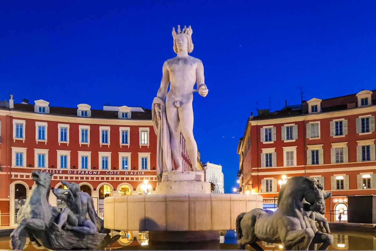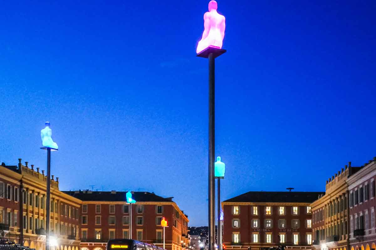 Besonders Abends erstahlt die Place Masséna in prächtiger Beleuchtung und die auf hohen Metallsäulen sitzenden und knienden Männerfiguren leuchten in grün, rot und gelb. Das Kunstwerk „La Conversation“ wurde vom spanischen Künstler Jaume Plensa 2007 geschaffen und symbolisiert die verschiedenen Kontinente.