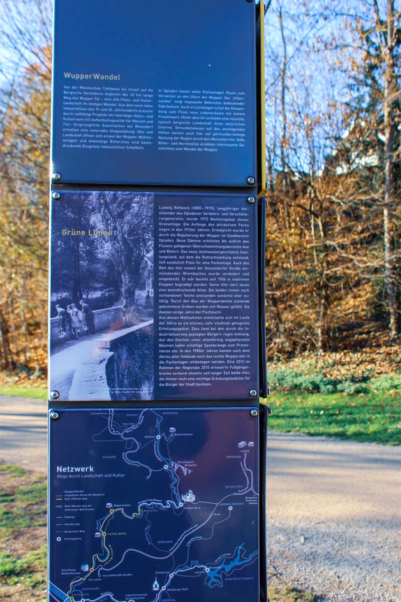 Während des 19.Jahrhundert war Opladen ein Zentrum der Textilwirtschaft und auch aus dieser Zeit gibt es einige interessante Baudenkmäler. Diese kannst du auf einem schönen Stadtspaziergang entdecken. Dazu empfehle ich dir die App Izi-travel. Hier findest du verschiedene Touren durch Opladen mit unterschiedlichen Schwerpunkten, die dich per Audio-Guide zu den einzelnen Sehenswürdigkeiten leitet und dir die wichtigsten Informationen zu den Stationen nennt. Probier es aus. Es ist interessant und unterhaltsam. Zahlreiche Schautafeln (blau) rund um die Wupper und die Schusterinsel geben zusätzlich Auskunft und mit alten Bildern interessante Einblicke in diese Zeit.