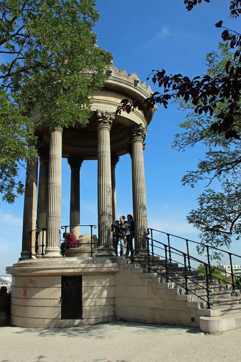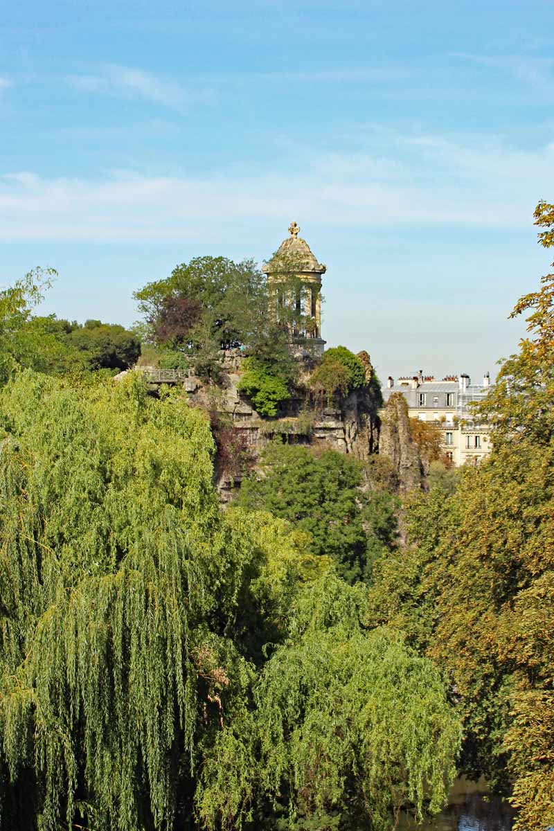 Wer an Pariser Parks denkt, dem kommen zuerst die Tuillerien und der Jardin du Luxembourg in den Sinn. Beides sind wunderbare Grünanlagen mitten in der Stadt, die einen Besuch lohnen. Aber beide sind hoffnungslos überfüllt, sowohl von Parisern als auch von den zahllosen Touristen. Etwas außerhalb des Zentrum, im 19.Arrondissement, liegt der auf einem ehemaligen Kalksteinbruch angelegte Parc Buttes-Chaumont. Anlässlich der Pariser Weltausstellung 1867 wurde der mit 25 Hektar größte Pariser Park als Landschaftsgarten mit Felsen, Grotten, Wasserfällen, Hängebrücke (von Gustav Eiffel entworfen) und Tempelchen angelegt.
